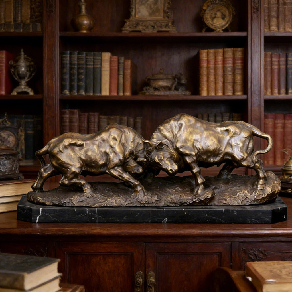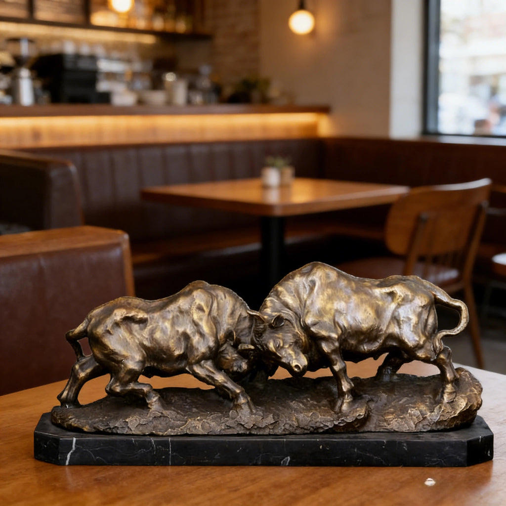 This striking dual bull sculpture captures the explosive energy of two powerful bulls locked in confrontation. Sculpted with realistic proportions and dynamic motion, the piece conveys raw strength, tension, and unstoppable momentum.