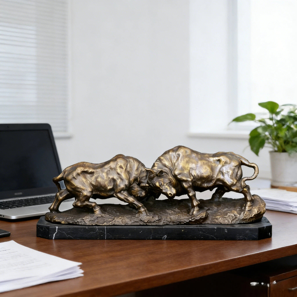 dual bull sculpture, brass bull statue, confrontation bull ornament, business power decor, office bull sculpture, symbolic animal statue, modern business decor, brass animal figurine, competitive spirit sculpture, finance office decor, executive desk ornament, collectible bull statue, market symbolism decor