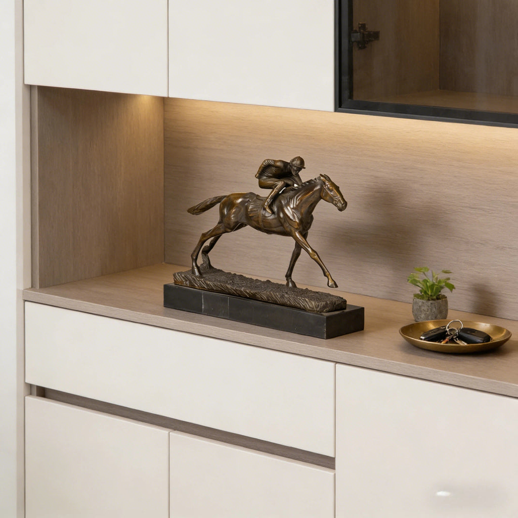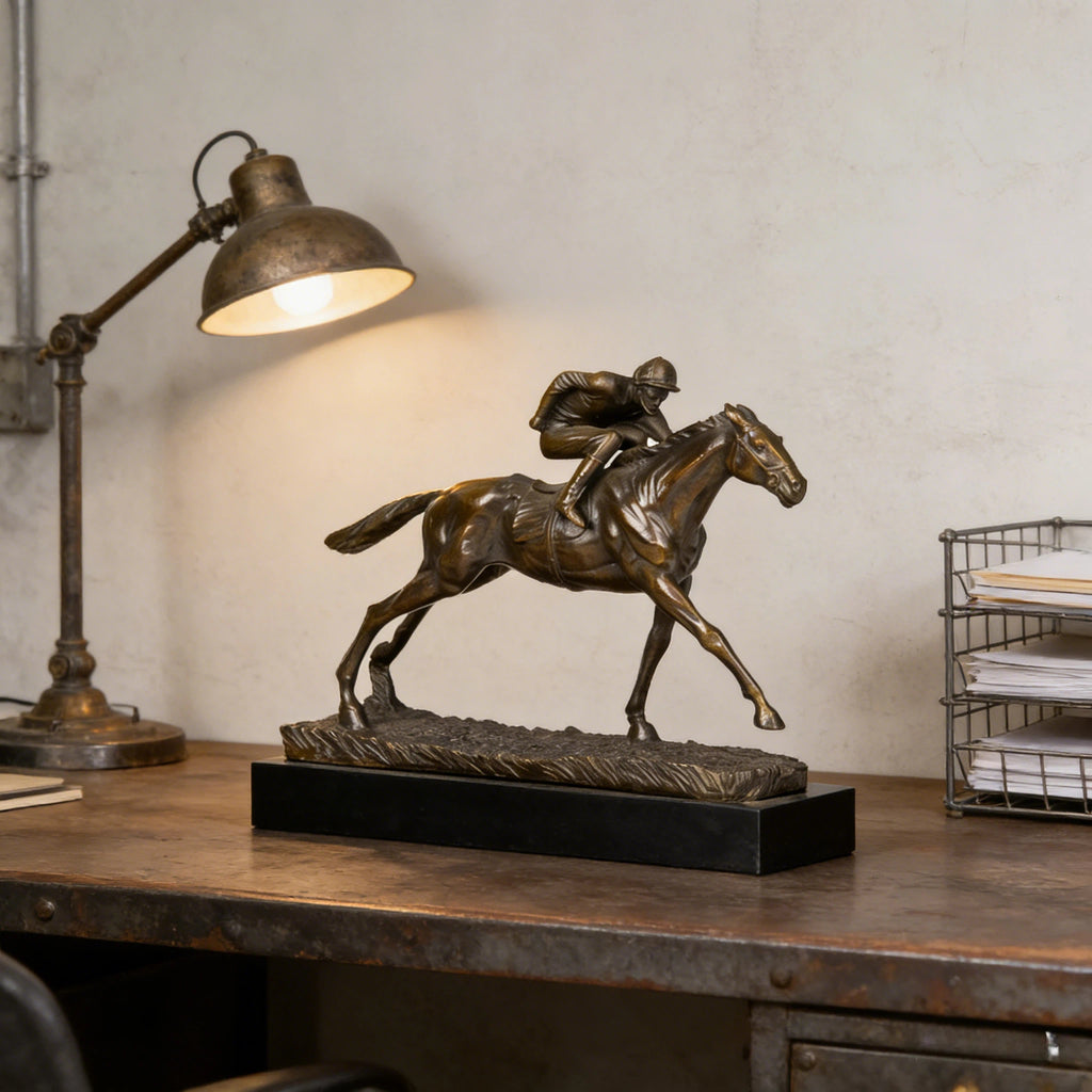 Keywords: horse racing bronze sculpture, jockey horse statue, sports bronze art, dynamic horse figurine, speed and power decor, office sports sculpture, bronze racing horse ornament, marble base sculpture, equestrian bronze statue, business gift sports decor