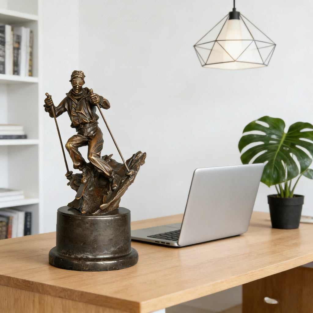 Capture the thrill of winter in this handcrafted bronze skier sculpture, frozen in a powerful gliding pose with ski poles in hand. Sculpted with realistic ski clothing and goggles, and finished in a rich dark-brown patina, it brings authentic alpine energy to any desk, shelf, or display cabinet.