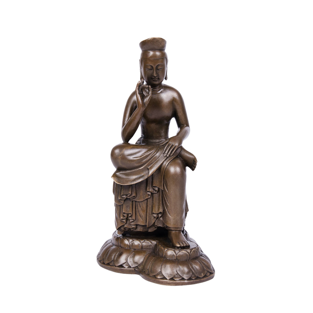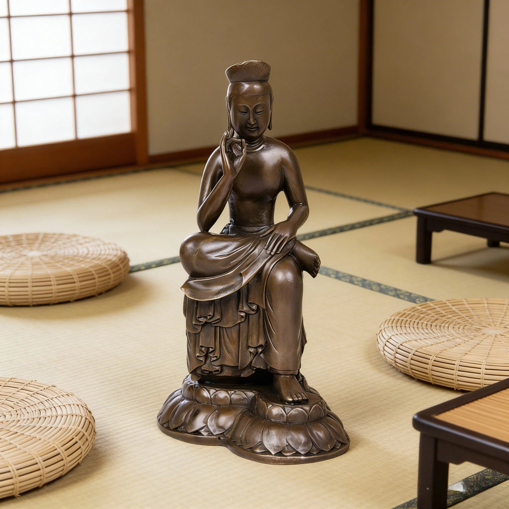 The flowing robe folds are cast with rhythmic precision, creating a sculptural cadence that conveys both outer ease (leisure, openness, and generosity) and inner fulfillment (joy, calm, and spiritual resilience). The hand-applied bronze-brown patina enriches the surface, allowing soft gradients of light and shadow to highlight expression and detail, evoking a timeless sense of serenity and warmth.